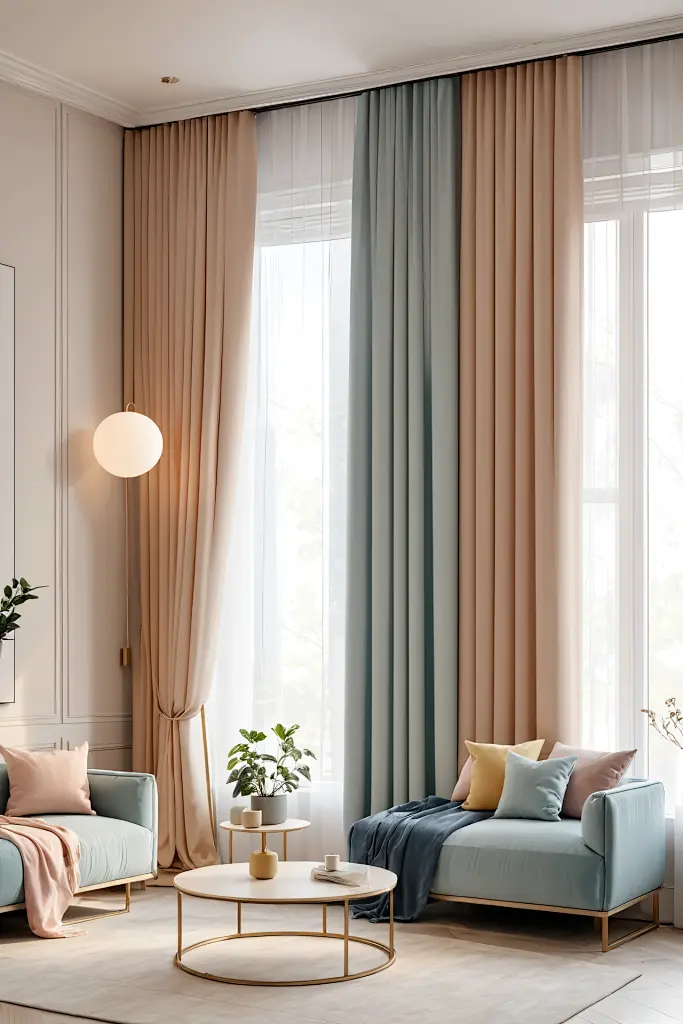 為現代簡約風格的客廳設計的窗簾,註重線條的簡潔流暢和色彩的低調和諧,搭配輕薄的紗簾。